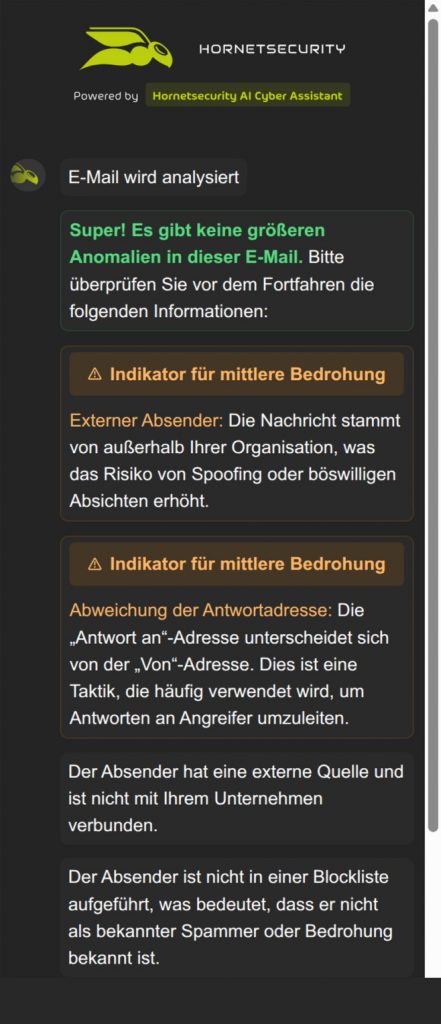 TopMail AI Email Security Analyst setzt genau hier an: Alle gemeldeten E-Mails werden mithilfe von Künstlicher Intelligenz (KI) in Echtzeit geprüft. Die Nutzer erhalten unverzüglich eine Einschätzung, ob das E-Mail harmlos oder gefährlich ist – inklusive konkreter Begründung und Handlungsempfehlung. Dadurch werden die Mitarbeitenden gestärkt und leisten gleichzeitig einen wertvollen Beitrag zur Sicherheitsarchitektur.